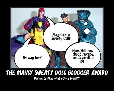 In honor of this young man who keeps his spirits up and keeps writing no matter what, I bestow upon him the Manly Sweaty Doll Blogger Award. Previous esteemed recipients of this award will attest that it is much more Manly that many other Blogger Awards, and although Lenny is only 11, I think he has the fortitude of many Manly men put together.