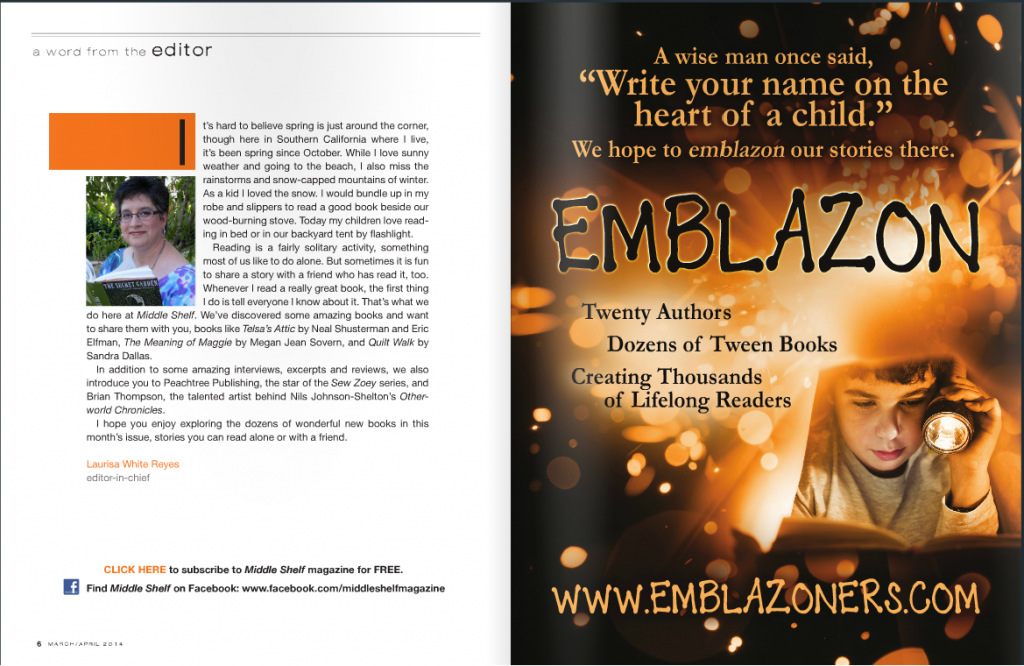 “Middle Shelf is a digital-only magazine featuring the best books for middle grade readers. Each bi-monthly issue includes author interviews, reviews, excerpts, and photo essays. Subscriptions are free.“