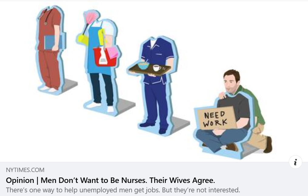 One more: how about we don’t undervalue/underpay “pink-collar” jobs (especially ones where they can’t fill the vacancies) and then they’d be more attractive to both men and women?
