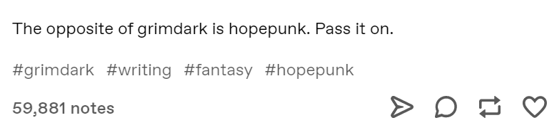 You reminded me that I wanted to write about hopepunk! Thank you! https://meta-narrator.com/2022/04/29/real-life-hopepunk/