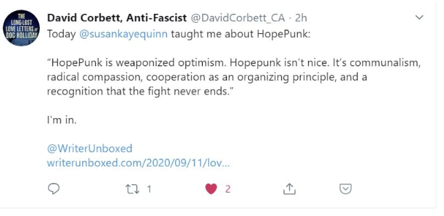 Drawn in by that vulnerability and his conclusion that a thread of hope through his work would make it meaningful to today’s readers, I left a lengthy comment. The gist was explaining hopepunk and how I’m driven to write it, right now:
