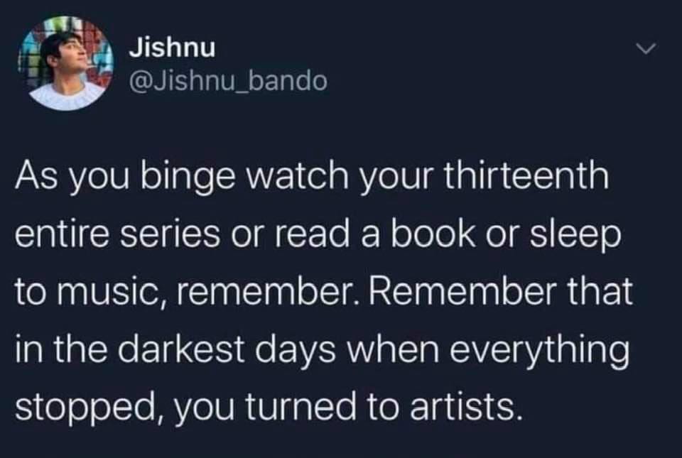 Keep creating and consuming art, my friends. Be gentle with yourself. When the hard things come, trust your gut, take care of your heart, protect your mental health, and wear a mask.