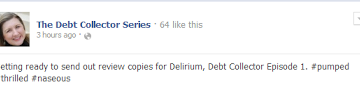 The final episode of Season One… Amazon, Barnes&Noble, Kobo, Smash, Goodreads …the third collection, Episodes 7-9… Amazon, Barnes&Noble, Kobo, Smash, Goodreads and the full Season One of Debt Collector! (ebook) Amazon, Barnes&Noble, Kobo, Smash, Goodreads and (print) Amazon, Createspace, Signed Copies (US only) I think I’ll take a nap now.